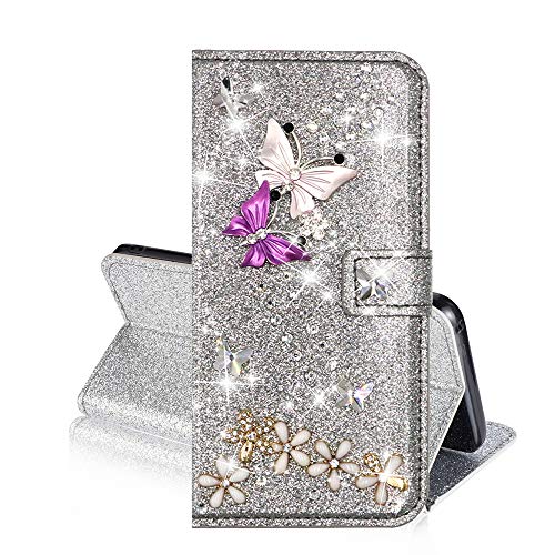 QC-EMART Cover per Huawei P30 Lite Custodia in Pelle Argento Glitter Paillette Luccichio Farfalla Portafoglio Porta Carta Guscio Caso Case Protettiva Custodie Cellulari per Ragazza