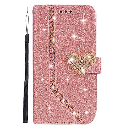 QC-EMART Custodia per Samsung Galaxy A5 2017 Cover in Pelle con Slot per Schede Interno TPU Antiurto Libretto Portafoglio Cuore Chiusura Magnetica Bling Rosa Glitter Bumper Flip Custodie Caso