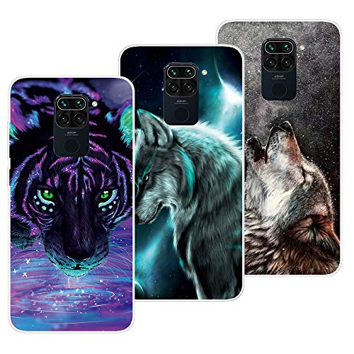 QC-EMART 3 Pezzi per Xiaomi Redmi Note 9 Cover Custodia in Silicone Morbida Trasparente con Disegni Stilosa Sottile Protettivo Case Copertura per Xiaomi Redmi Note 9 Nero Blu Lupo