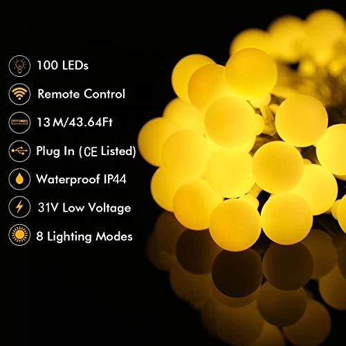 Qedertek Luci Albero di Natale, 10M Catena Luminosa con 100 Palline, Luci Natale da Esterno ed Interno, 8 Modalita, Telecomando, Timer, Luci Bianco Caldo Addobbi Albero di Natale, Terrazza, Party