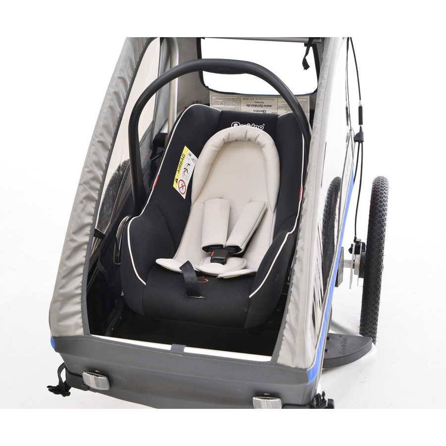 Dettagli prodotto Scocca del seggiolino auto: Da 0 a 13 kg (fino a circa 18 mesi) Guscio per seggiolino auto Gruppo 0+ Fissaggio sicuro e facile in auto Semplice regolazione del poggiatesta Si aggancia semplicemente al sedile posteriore del rimorchio per bici per bambini utilizzando l'adattatore in dotazione Il modo più sicuro per trasportare i bambini fino a 13 kg di peso. Si prega di notare che un rimorchio per bici a due posti non può più essere utilizzato come tale una volta montato il seggiolino auto per neonati, poiché c'è spazio solo per un bambino. Compatibile con il supporto Maxi-Cosi Sistema di cinture a 5 punti Maniglia di trasporto regolabile Fodera lavabile Dettagli sul prodotto Adattatore: Qeridoo Qeridoo Adattatore per installare il guscio del seggiolino auto o Maxi Cosi nel rimorchio della bicicletta Standard di sicurezza comprovati dell'industria automobilistica Trasporto sicuro di un bambino in un rimorchio per biciclette a uno o due posti Passaggio dall'auto al rimorchio per bici senza bisogno di cinture di sicurezza Sostituisce il sistema di sedili nel rimorchio Compatibile con: Kidgoo 1 (2019), Kidgoo 2 (2019-2022), Sporttrex 1 (2019), Sporttrex 2 (2019-2022) Dimensioni e peso: Dimensioni del seggiolino auto per neonati (lunghezza x larghezza x altezza): 70 x 34 x 38 cm Peso del seggiolino auto per neonati: 3,7 kg Istruzioni per la cura: Rivestimento lavabile in lavatrice a 30°C La fornitura comprende: Seggiolino auto adattatore Riduttore per seggiolino Tettuccio parasole