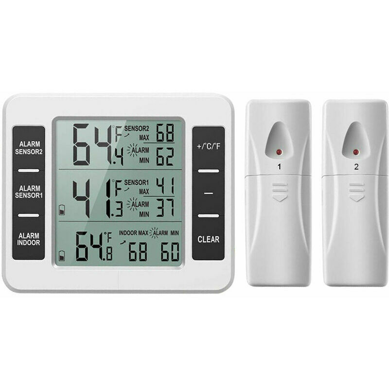 Descrizione del prodotto Grazie per aver acquistato nel nostro negozio! 12 mesi di servizio di garanzia, in caso di problemi con il prodotto, ti preghiamo di contattarci ogni volta. Troveremo la soluzione migliore per te! Il display LCD a grandi cifre. Registra le temperature minime e massime e fornisci letture storiche della temperatura.Versione migliorata per un monitoraggio più accurato e dati più accurati.Questa funzione ti consente di monitorare facilmente le variazioni di temperatura nel tuo frigorifero e di fornire una doppia protezione per la tua sicurezza alimentare.Adatto per la casa, il ristorante, caffè ecc. Requisiti di alimentazione: 1 unità principale - 2 x AAA (non inclusi) 2 trasmettitori - 4 x AA (non inclusi) Nota: 1. Non mettere il trasmettitore direttamente sotto la pioggia. 2.Quando l'indicazione è sfocata, sostituire la batteria. 3. Non installare la batteria al contrario, non posizionare il ricevitore vicino a metallo. 4. Si prega di utilizzare batterie di alta