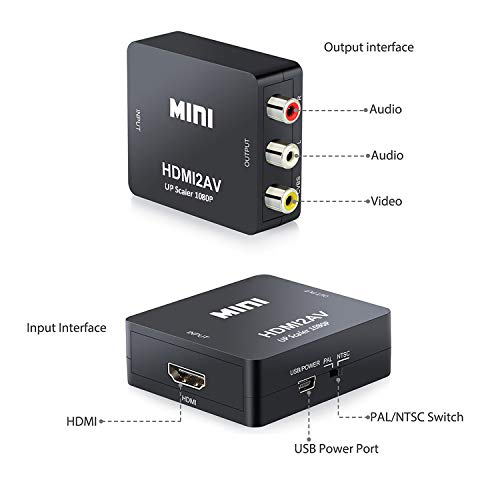 HDMI a AV convertitore adattatore: 1x ingresso HDMI, 2x jack uscita RCA - R / L segnale audio stereo e l'altro jack RCA è video (video composito). PAL e NTSC selezionabile.