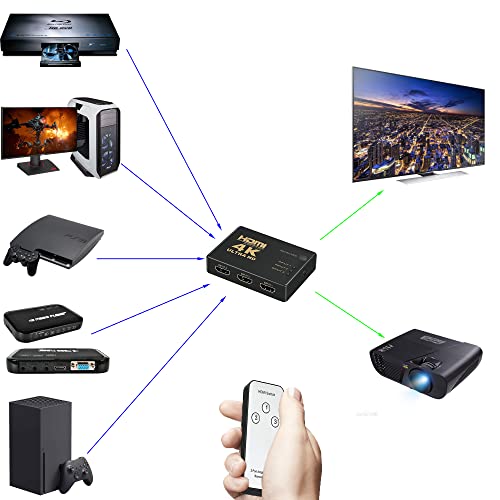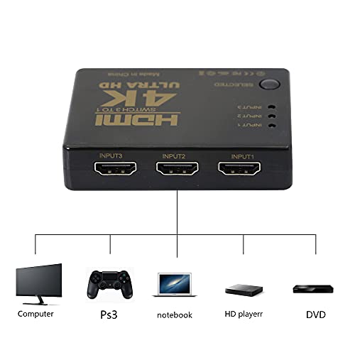 ☆ Switch HDMI 3 in 1 Out: questo switch HDMI può trasferire facilmente video e audio da 3 dispositivi HDMI a uno schermo HDMI. Puoi passare facilmente tra tre sorgenti di ingresso HDMI senza dover collegare o rimuovere dispositivi. (Con commutazione manuale o telecomando)