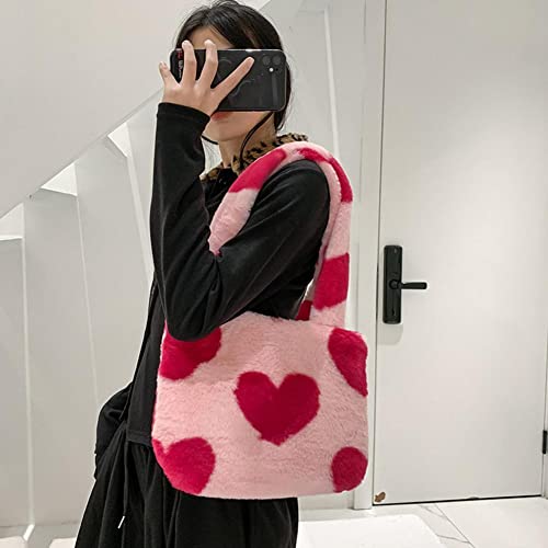 QIANSHENG Borsa a Tracolla soffice da Donna Borsa a Tracolla pelosa da Donna Borsa Grande e Carina con Stampa a Cuore d'Amore Borse in Peluche per Ragazze Portafoglio Invernale soffice