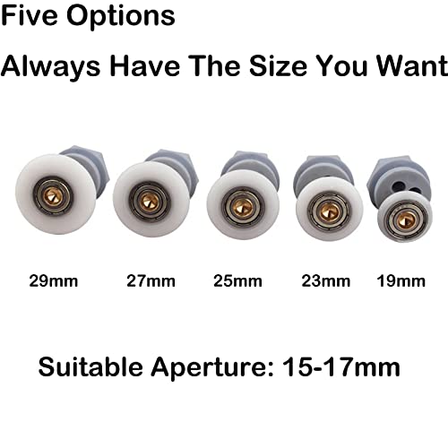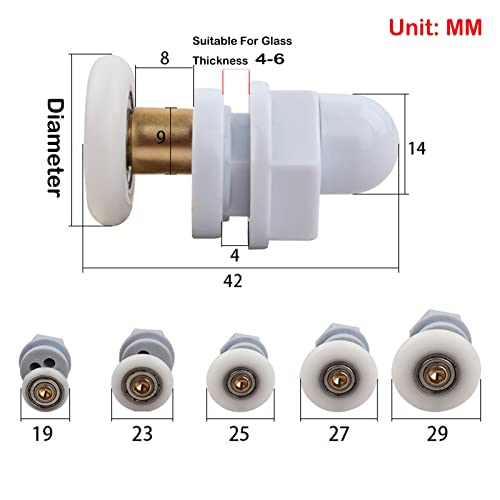 【Dimensioni】: rulli per porte doccia con diametro di 25 mm, progettati per adattarsi a porte in vetro di spessore 4-6 mm. Apertura di installazione 15-17 mm disponibile.
