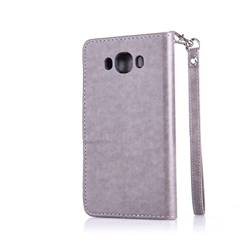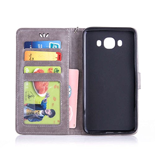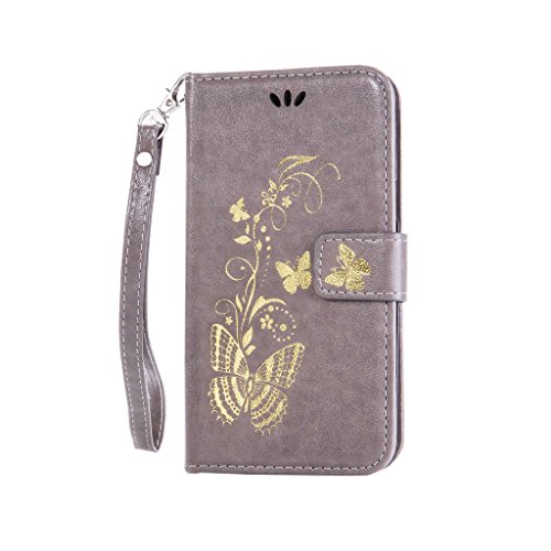 Qimmortal - Custodia a portafoglio con design a flip per iPhone 6, 6S con protezione per schermo in omaggio, antigraffio, con retro morbido in silicone, stampa elegante dorata di farfalla con fiori, realizzata in pregiata pelle di poliuretano, dotata di scomparto per carte di credito e laccetto magnetico, compatibile con iPhone 6 / 6S, PU, Grey, Samsung Galaxy J7(2016)/J710