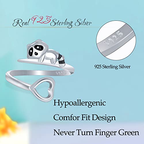 Qings Anello Regolabile Animali Procione per Donne Argento Sterling 925 Anelli Aperto Carino Nero Vintage Panda Orso Gioielli Regalo per Ragazze gli Amanti degli Animali