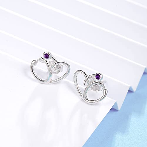 Qings Orecchini Perno Forma Cuore con Stetoscopio 925 Argento Sterling Pietra Portafortuna Febbraio Ametista Orecchini Regali per Donna Infermiere Dottore RN Studente Medicina