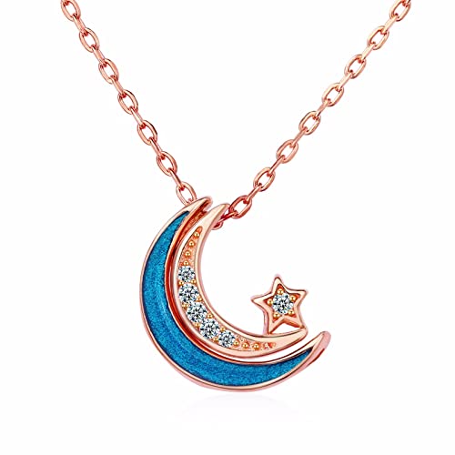 Qings Luna e Stelle Collana in Argento Sterling 925 Blu Luna Crescente con Stelle Pendente Collana Oro Rosa Zirconi Collana Compleanno Natale Regalo per Donna Ragazza