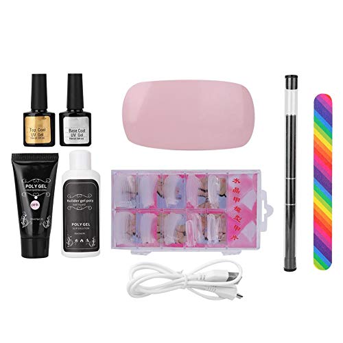 [CARATTERISTICHE]: contiene colla per estensione, gel per ricostruzione, lima per unghie arcobaleno, penna per nail art, punte di unghie finte, strato superiore, mano di fondo e lampada per asciuga unghie.Disponibile nei colori trasparente, rosa e caffè per soddisfare le diverse esigenze.
