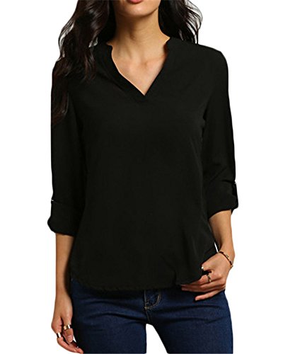 Qitun Donna Camicia Blusa Maglia Chiffon Manica Lunga Casual Elegante Ufficio V-Collo Nero 3XL