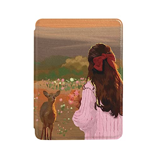 QIUFEN Custodia Protettiva per E-Book per Kindle Touch 2014 (per Kindle 7A Generazione) Ereader Slim Cover Protettiva Smart Case per Modello Wp63Gw Funzione Sonno/Veglia-Fiore Bush Girl Elk