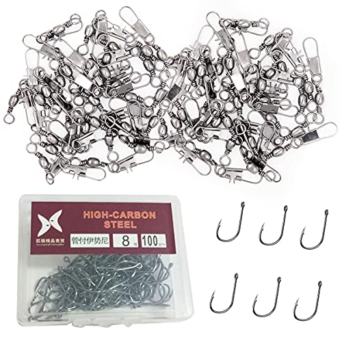 Qixuer 100 Pezzi Anelli Solidi da Pesca,Girelle a Scatto da Pesca Girelle con Cuscinetti a Sfera in Acciaio Inox con 100 Pezzi Amo da Pesca Spinato Gancio da Pesca per la Pesca in Mare