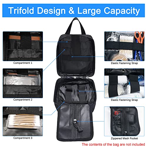 【Design a Tre Ante】 La borsa medica militare utilizza un design a tre ante, internamente ha scomparti spaziosi che includono diverse tasche, robusti passanti elastici e portastrumenti, una cinghia di sicurezza in gancio e anello e scomparti in rete per piccoli articoli di pronto soccorso. La borsa medico può contenere le tue forniture vitali di pronto soccorso, como cotone, bisturi, forbici, disinfettante, tamponi di cotone, adesivi emostatici, filo
