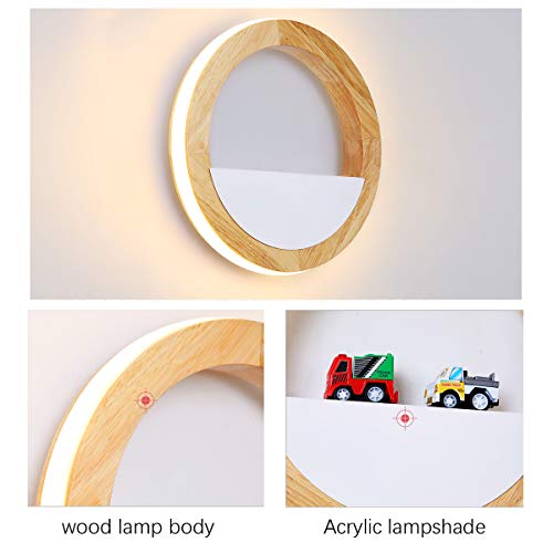 QJUZO Lampada da Parete Bambini Legno, 15W LED Rotondo Applique da Parete Interno Per Camera da letto Soggiorno Corridoio, Bianco Caldo, Lampada Muro Comodino Rustico
