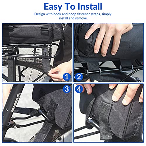 Facile da installare: non sono necessari attrezzi. Le borse da bicicletta sono progettate con 4 cinghie di fissaggio a gancio e cerchio per un'installazione facile e rapida su tutti i tipi di biciclette con sedile posteriore, come mountain bike, bici da strada, ecc. Basta regolare il cinturino per una lunghezza adeguata e una moderata tenuta della tua bici, la borsa portabiciclette posteriore si posiziona saldamente sul portabici.