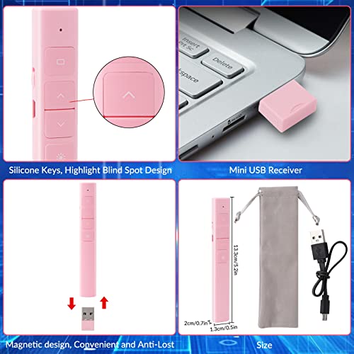 【Design unico】①Il design della chiave in morbido silicone fa sentire il tuo pollice a tuo agio. ②Il pulsante rialzato ti impedisce di premere il pulsante sbagliato. ③ Quando la batteria inizia a scaricarsi, l'indicatore LED di bassa potenza lampeggia. ④ Design all-in-one, il ricevitore mini USB è memorizzato nella coda dell'host attraverso il sistema magnetico. ④ Portata della luce rossa: 200 M. Puoi controllare liberamente a 360° il tuo telecomando di presentazione wireless nella stanza,