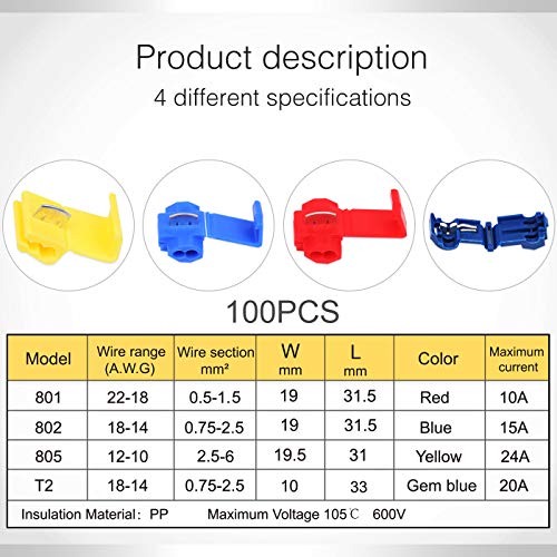 Qliver - Set di 100 connettori di derivazione rapidi, dimensioni assortite, facili da utilizzare per cavi di collegamento rapidi, sezione cavo 0,5 mm2-6 mm 2/10-24 AWG