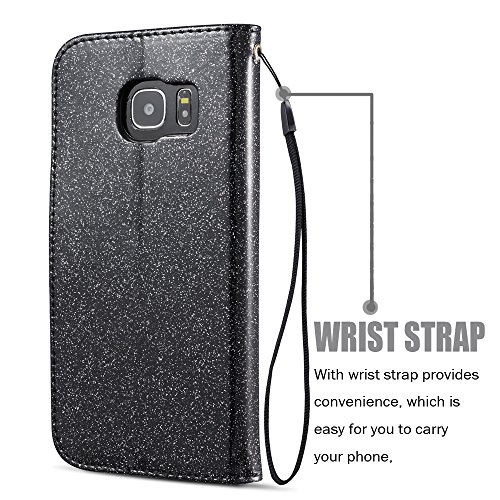 QLTYPRI Case for Samsung Galaxy S6 Edge, Glitter Sparkle Smooth Cover with Inlaid Loving Heart Diamond Design [Magnetic Closure] [Card Slot] Stand Function Luxury Bling PU Leather Case with Wrist Strap Flexible TPU Case Wallet Flip Case for Samsung Galaxy S6 Edge - Black
