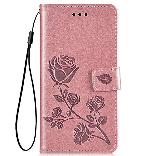 QPOLLY Cover Compatibile con Huawei Honor 9 Lite Flip Custodia Caso Libro Pelle PU e TPU Silicone con Fiori Disegni Funzione Supporto Chiusura Magnetica e Slot per Schede Portafoglio Custodia,Oro Rosa
