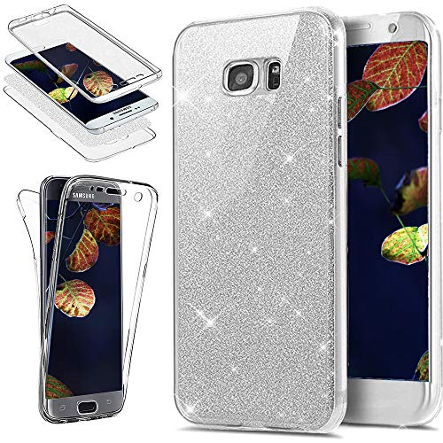 QPOLLY Cover Compatibile con Samsung Galaxy S7 Trasparente 360 Gradi Silicone Morbido Custodia Glitter Brillantini Cover Ultra Sottile Totale Davanti e Dietro Gel Custodia,Argento