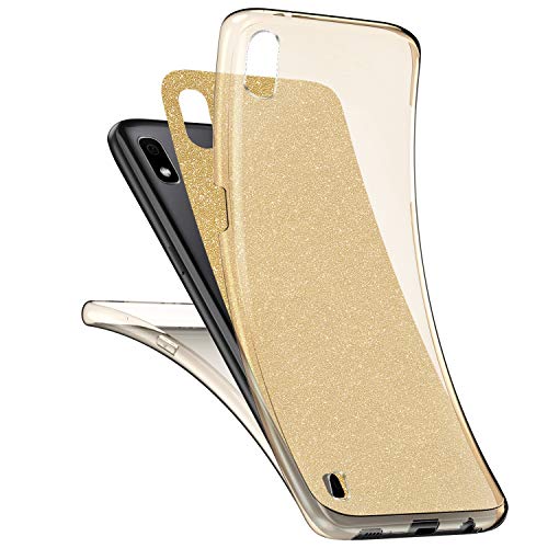 QPOLLY Cover a 360 gradi, compatibile con Samsung Galaxy A10, con brillantini, glitter, trasparente anteriore e posteriore, ultra sottile in silicone TPU gel trasparente con doppia faccia, colore: oro