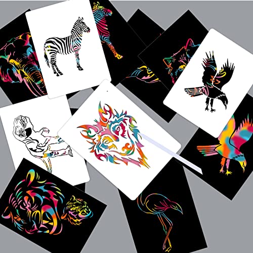 【Set artistico Rainbow Scratch per bambini】Riceverai 9 carte da grattare magiche opache nere, 10 modelli di disegno di plastica bianca con disegni di animali e 1 stilo di plastica. Set artistico combinato di carta da grattare arcobaleno e dimensioni del modello animale: 11,4 * 8,2 pollici / 29 * 21 cm.