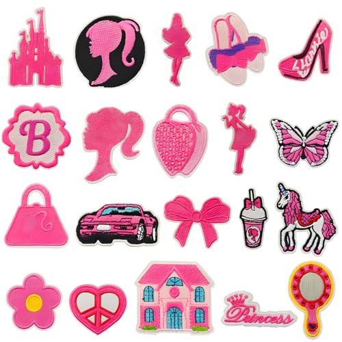 Toppe da Stirare Principessa rosa: il set di toppe termoadesive ricamate include 20 toppe da stirare su tessuto rosa caldo, diversi modelli: cowboy rosa, castello, borsa rosa, specchio, tacchi alti, fiocco, farfalla, fiore, auto sportiva, unicorno, ecc.