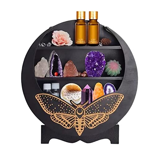 Qserd Scaffale con display in cristallo | Moth Moon Scaffale per olio essenziale in legno, decorazione per streghe e streghe rustiche, per cristalli, pietre, fissato a parete