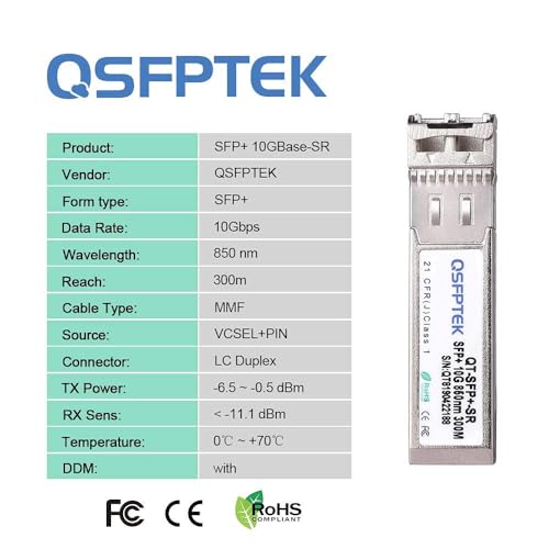 Modulo SFP+ 10GBASE-SR: velocità dati 10Gb / s, multimodale, connettore LC duplex, lunghezza d'onda 850nm, distanza di trasmissione fino a 300m, supporto DDM, temperatura di lavoro: 0 ℃ ~ +70 ℃. Potenza Tx (dBm): -6,5 ~ -0,5, Sens. Rx (dBm): < -11,1.