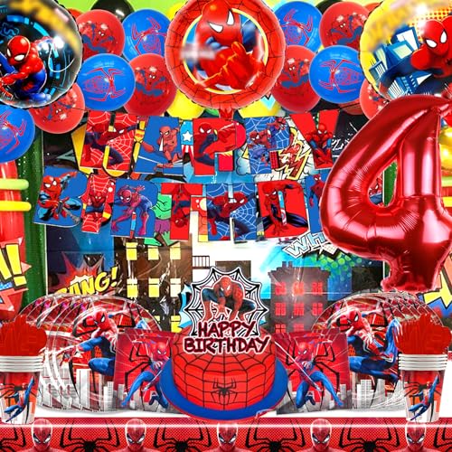 Qtizxrui 93 PCS Decorazioni Palloncini Spiderma, Kit Palloncini Decorazioni Compleanno Spiderma 4 Anni, Bambini Feste Compleanno Includere Piatti, Tovaglioli, Tovaglie ect Decorazioni Adatto 10 Ospiti