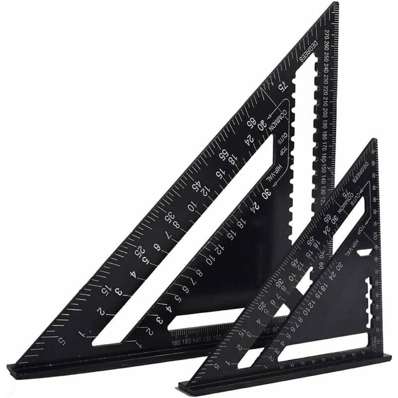 Stile metrico: include righello triangolare metrico da 17 cm e 30 cm, con finitura nera opaca per evitare l'abbagliamento, resistente alla corrosione e durevole, non facile da rompere. Nessun bordo tagliente, non ti farà male alla mano. Qualità superiore: il gallone quadrato metrico, il gallone quadrato realizzato in lega di alluminio di alta qualità, elevata durezza, forte tenacità, non facile da arrugginire. Ampiamente usato: questa squadra da carpentiere può essere utilizzata come goniometro, mitra, guida per sega plotter, squadra per inquadratura e righello, ideale per tutti i progetti di costruzione e ristrutturazione. FACILE DA SEGNARE LE TUE LINEE DI TAGLIO: questo righello triangolare utilizza un bordo più spesso, può essere utilizzato direttamente con la sega contro il quadrato per tagli trasversali o tagli angolati utilizzando la scala del goniometro incisa, consente di contrassegnare rapidamente e con precisione le linee di taglio sulle traverse. Dimensioni: righello