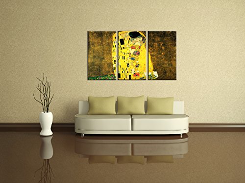 Quadri moderni stampa su tela A333- KLIMT-"IL BACIO" 3 panelli misure complessive: 150cm x 90cm, pronto da appendere già intelaiati.