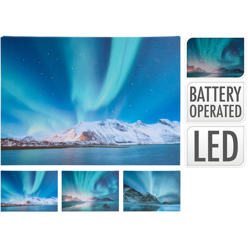 Quadro 3 motivi variegati con luci aurora boreale.. materiale: tela e mdf, misure: 28x38cm, (larghezza/altezza) peso: 375g, 3 scene aurora varie. ognuna con 40 punti lampeggianti. 2 batterie aa non incluse.