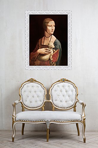 Quadro Stampa su Tela Leonardo da Vinci La Dama con l'ermellino con Cornice in Legno Bianco Anticato Misura 83x63 CM