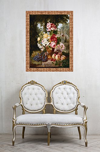 Lux Quadro Stampa su Tela William John Wainwright A Vase of Summer Flowers And Fruit con Cornice in Legno Oro Classico Misura 53x43 CM