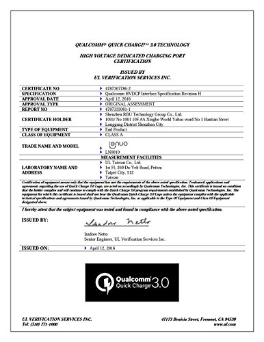 Tecnologia Avanzata Qualcomm Quick Charge 3.0: Si aumenta l'efficienza di ricarica, in soli 35 minuti si può caricare i dispositivi compatibili da 0% a 80%. Inoltre fornisce la ricarica standard per i dispositivi generali, 4 volte più veloce rispetto caricabatterie tradizionali. Retrocompatibile anche coi dispositivi che si ricarica con Quick Charge 1.0 e Quick Charge 2.0