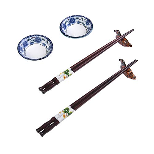 Quantum Abacus Pregiato Set di Bacchette Anemone Blu 2 Bacchette cesellate in Legno, 2 poggiabacchette, 2 Ciotole in Ceramica, in Confezione Regalo, MOD. I_S2-B-W-07