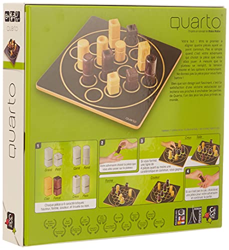 Uno dei giochi più apprezzati al mondo. In questo gioco tutto in legno, il vincitore è il primo ad allineare quattro pezzi con almeno una caratteristica comune... Non così semplice quando il tuo avversario sceglie i pezzi che giochi! Quarto è un gioco astratto che combina riflessione e sottigliezza. Disponibile anche in versione mini.