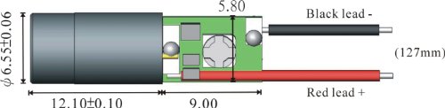 Lunghezza d'onda: 650 nm. Potenza di uscita: classe III a - inferiore a 5 mW. Funzionamento a 2,6~5 V, DC. Protezione ESD da 15 kV. Dimensioni: 6,55 mm x 21,1 mm.