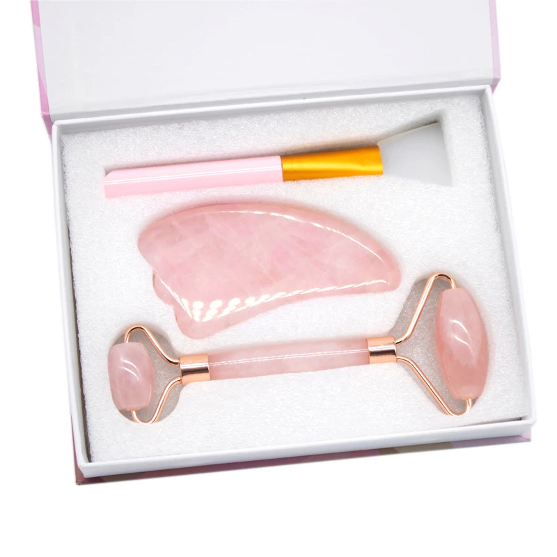 Rose Quartz Roller Facial Massager Powder Crystal Roller Jade Roller Scraper Mask Brush Three-piece Beauty Face-lifting Tool