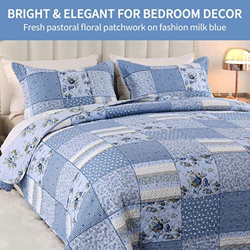 Qucover Set da 3 Pezzi Copriletto Matrimoniale, Patchwork Copriletto Trapuntato 230x250cm + 2 Federe 50x70cm, in Microfibra Poliestere, Copriletto Reversibile Leggero Motivo di Fiori Blu