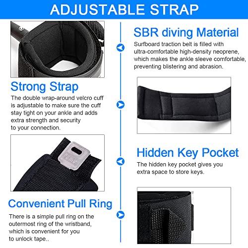 【Cinturino per il piede girevole a 360 gradi】 Sia il polsino della caviglia che il salvaguida, dotati di un connettore girevole in acciaio girevole a 360 gradi a due vie, impediscono efficacemente che il leash si aggrovigli e garantiscono la massima libertà per il surfista sulla tavola da surf. E tutti i guinzagli da surf sono dotati di una tasca per chiavi per spazio extra per riporre le chiavi.