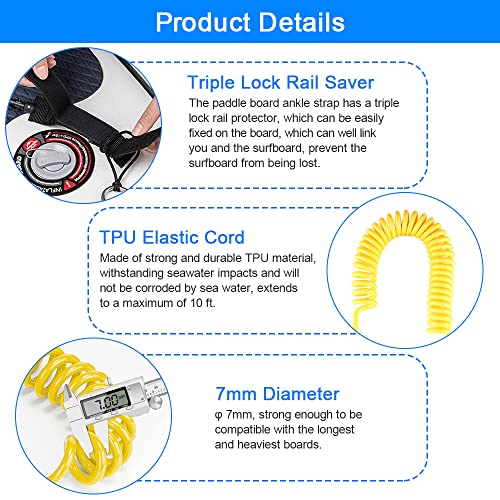 【Guinzaglio per tavola da surf forte e sicuro】 Il guinzaglio per tavola da surf è realizzato in poliuretano TPU elastico super resistente da 7 mm di alta qualità che è durevole. Abbastanza forte per gestire le tavole più lunghe e pesanti che possono resistere alla corrosione dell'acqua di mare per molto tempo. Il design a spirale elimina la resistenza del leash in acqua e ti protegge dalla caduta dalla tavola.