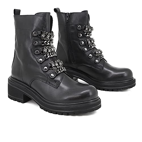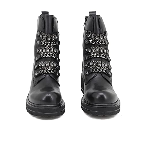 QUEEN HELENA Anfibi di Pelle Stivaletti con Tacco Stringati Plateau Invernali Casual con Lacci Donna S2358 Nero 36