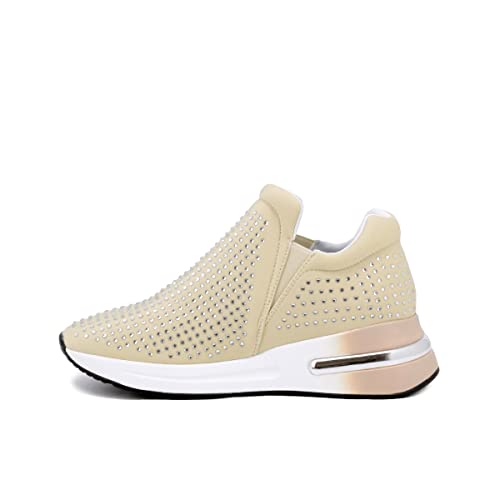 QUEEN HELENA Sneakers Senza Lacci Scarpe da Ginnastica con Strass Casual Donna X24-51 (Beige, Numeric_37)