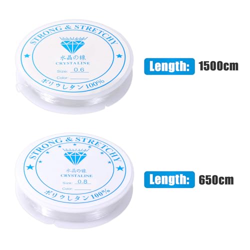 Quantità di Taglia: 2 pezzi filo di perline trasparente, diametro 0,6mm e 0,8 mm, lunghezza 15m e 6,5m, Ha un aspetto cristallino e può essere tagliato liberamente alla lunghezza desiderata