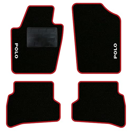 QUEMAR Kit Tappetini Auto compatibili con Polo V 2009-2017 (6R - 6C) / Set Tappeti Moquette e Gomma su Misura (2 Anteriori + 2 Posteriori) / Ricami e Colori Personalizzati (2 Ricami, Bordo Rosso)