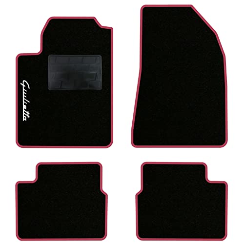 QUEMAR Kit Tappetini Auto compatibili con Alfa Romeo Giulietta 2010-2016/ Set Tappeti Moquette e Gomma su Misura (2 Anteriori+2 Posteriori)/Ricami e Colori Personalizzati (Bordo Fucsia, 1 Ricamo)